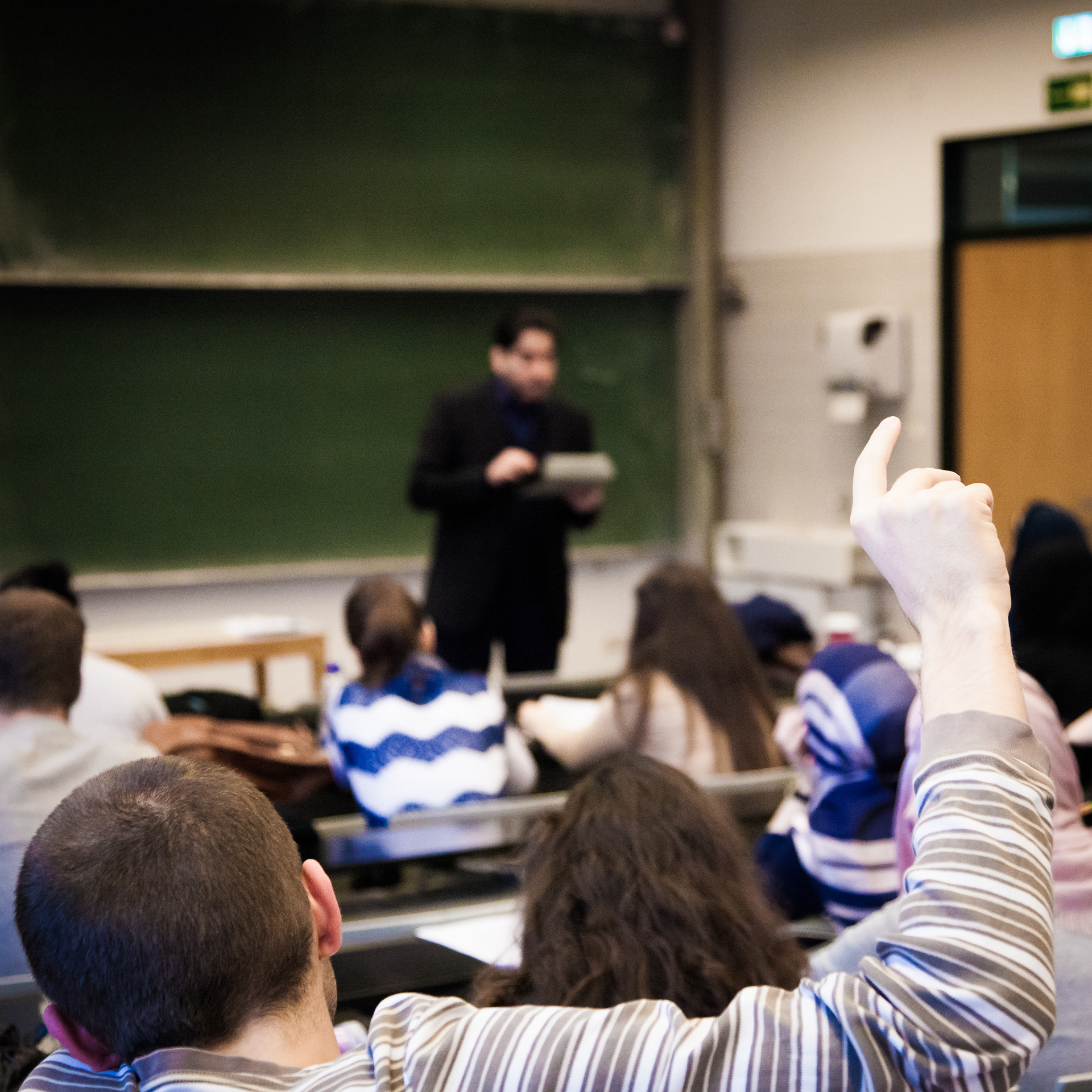 - Vorlesung im Hörsaal KP (Kernphyik) 404 bei Prof. Dr. Mouhanad Khorchide, Stellv. Direktor des Zentrums für Religiöse Studien, Leiter des Zentrums für Islamische Theologie und Professor für Islamische Religionspädagogik